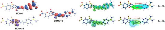 To investigate the charge transfer mechanism, we utilized hole-electron analysis. The methodology involved using various indices, including the centroid distance (D) index, the degree of overlap (Sr) index, the width distribution (H) index, degree of separation (t) index, hole delocalization index (HDI), and electron delocalization index (EDI) via the Multiwfn program. The Sr index was utilized to measure the extent of hole-electron overlap, while the D index quantified the distance between the hole and the electron’s mass center. The H index provided an average distribution range of electrons and holes, and the t index evaluated the separation of electrons and holes. HDI and EDI were used to assess the degree of hole-electron delocalization, which indicated the uniformity of the distribution. The relevant formula is as follows: