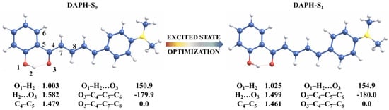 The optimized geometries of DAPH in the S0 and S1 states. The labeling of atomic color: O: red; C: blue; H: white; N: yellow, the bond length in Å, the angles are in degrees.