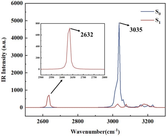 The optimized geometries of DAPH and the corresponding parameters in the S0 (S0-min) and S1 (S1-min) states are shown in Figure 5. All structures are ensured to be located at the minimum energy point, without virtual frequency. Compared with the structure in the S0 state, the dihedral angles of O3–C4–C5–C6 and C7–C8–C9–C10 in the S1 state change from −179.924° to 179.980° and −0.029° to −0.004°, respectively, indicating that the geometry of DAPH tends to be flattened after photoexcitation. In addition, after the reaction with thiophenol, the DNP group of DAPH-DNP is eliminated, releasing the phenol group, which can form an intramolecular hydrogen bond with the adjacent O atom. The O1–H2 bond length of DAPH is increased from 1.003 Å (S0-min) to 1.025 Å (S1-min), and the H2…O3 bond length is reduced from 1.582 Å (S0-min) to 1.499 Å (S1-min). Moreover, the bond angles of O1–H2…O3 increased by 4.0° from 150.9° (S0-min) to 154.9° (S1-min). After photoexcitation, the strength of the hydrogen bond is increased, thereby promoting the ESIPT process. To further verify whether the hydrogen bonding in the S1 state is enhanced, the calculated IR vibrational spectra of the relevant hydrogen bond are presented. The results depicted in Figure 6 indicate a significant red-shift of 403 cm−1 in the IR vibrational frequency of O1–H2, from 3035 cm−1 (S0-min) to 2632 cm−1 (S1-min), confirming the enhancement of the hydrogen bonding phenomenon. This observation is consistent with the structural analysis view.
