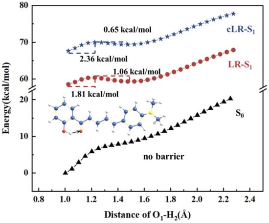 We first computed the spectral data with different functionals, and the results are listed in Table S1, which indicate that the calculated absorption and emission energies of DAPH-Enol at the B3LYP-D3(BJ) [34,35] level (2.49 eV/2.14 eV) are more comparable to the experimental values (2.68 eV/1.90 eV). However, it is widely recognized that the conventional functional B3LYP might tend to underestimate the energy of the charge transfer (CT) state. On the other hand, the inclusion of solvent effects within the linear-response (LR) scheme may lead to an overestimation of the CT state energy. The interplay between these factors often results in an error-cancellation phenomenon in LR-B3LYP, effectively describing the energy of the CT state [36,37]. By combining a range-separated functional with a corrected LR (cLR) solvation scheme, it is possible to achieve a genuinely accurate depiction of the CT state’s energy. Therefore, we performed the geometry optimizations at the LR-B3LYP level, and then recalculated the energy landscape using the cLR-ωB97XD approach.