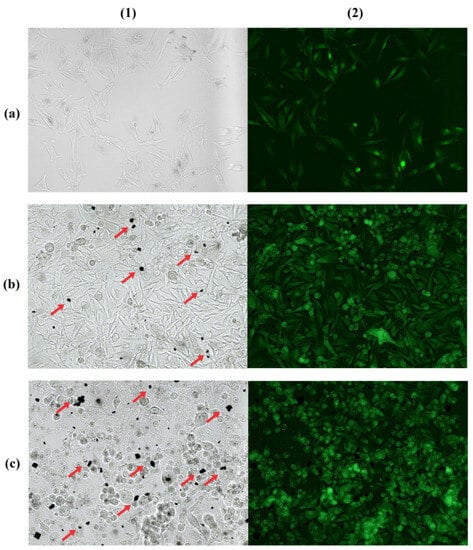Bright field (1) and fluorescence microscopy (2) of cell concentration 2 × 105 cells with 20 µM IR-780 (a); 4 × 105 cells with 40 µM IR-780 (b); and 4 × 105 cells with 80 µM IR-780 (c). Red arrows indicate excess dye crystals at highest concentrations of IR-780. Obtained with Leica DM 2000 Led fluorescence microscope (200×).