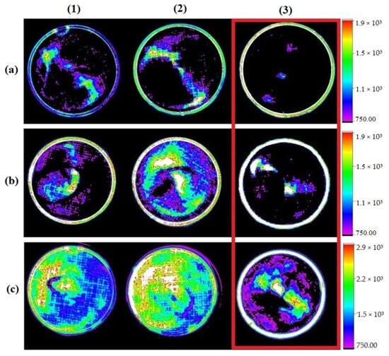 Image showing fluorescence emitted by the addition of IR-780 at concentrations of 20 µM (1), 40 µM (2), and 80 µM (3) in different cell concentrations: 1 × 105 (a), 2 × 105 (b), and 4 × 105 (c). Red highlight on highest concentration of IR-780 showing smaller areas of fluorescence. Obtained with In-Vivo Xtreme, Bruker.