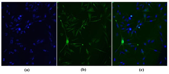 B16-F10 cell with its nuclei stained with Hoechst 33342 (a); cytosol stained with IR-780 (b); and overlaid images showing the difference between nucleus and cytosol (c). Obtained with Leica DM 2000 Led fluorescence microscope (200×).
