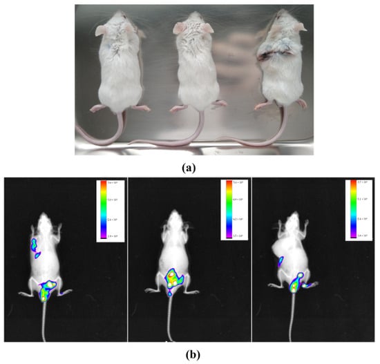 Animals showing visible dorsal subcutaneous nodules (a); images of animals in In-Vivo Xtreme image system with their respective fluorescence intensity scales (b). The images show higher fluorescence intensity in the caudal abdominal region and little or no fluorescence in the subcutaneous nodule region.