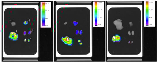 Organ’s fluorescence image of three animals with their respective scales of fluorescence intensity acquired by the equipment In-Vivo Xtreme image system; liver (1), lungs (2), kidneys (3) testicles (4), and tumor (T), at the same sequence.
