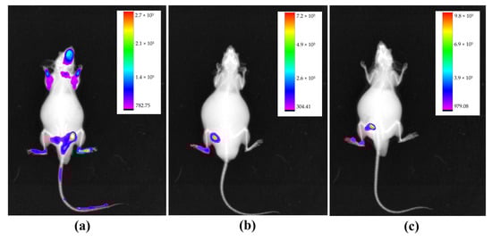 All animals in the group presented abdominal distension, compatible with ascites. One animal presented multiple areas of fluorescence (a), while animals with more pronounced ascites presented limited fluorescence images (b,c). Obtained with In-Vivo Xtreme, Bruker.