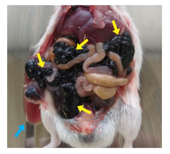 Abdominal necropsy. Several tumor nodules disseminated throughout mesentery are evidenced by yellow arrows; blue arrow demonstrates the ascitic fluid.