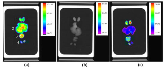 Fluorescence image of organs of three animals with their respective scales of fluorescence intensity acquired by equipment In-Vivo Xtreme image system; lungs (1), kidneys (2), liver (3), and testicles (4), at the same sequence. Lung with more nodules showing no fluorescence (a), lung with significant nodules with mild fluorescence (b), and less affected lung with higher fluorescence (c).