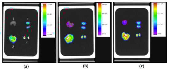 Organ fluorescence image of three animals with their respective scales of fluorescence intensity acquired by the In-Vivo Xtreme image system: kidneys (1), liver (2), lungs (3), and testicles (4), at the same sequence. Animal with a lower amount of ascitic fluid presenting higher fluorescence (a), animal with higher presence of ascites without fluorescence labeling (b), and animal with moderate ascites presenting low fluorescence intensity (c).
