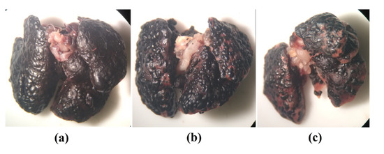 Macroscopic image of lung most affected by numerous malignant tumor nodules on pleural surface (a); lung with high involvement (b); lung with lower involvement (c).