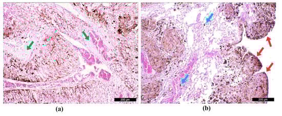 Histological image of the lung parenchyma with green arrows highlighting a few areas of intact tissue surrounded by metastatic tumor nodules (a), histological image of the lung pleura with red arrows showing nodules throughout the pleural surface and blue arrows demonstrating isolated foci of metastasis in lung parenchyma (b).