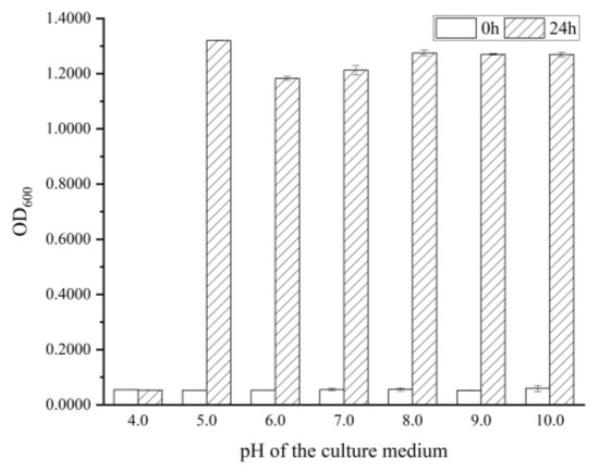 Nutrient broth culture medium was prepared according to the formula, and its pH was adjusted to 3.0, 4.0, 5.0, 6.0, 7.0, 8.0, 9.0, and 10.0 by using 1.00 mol/L hydrochloric acid and sodium hydroxide solutions, with each shake flask containing 50.0 mL. A 2% (v/v) bacterial suspension (OD600 was 1.2) was inoculated and incubated at 37 °C, 180 rpm for 24 h. Afterwards, OD600 of the bacterial suspension was measured.