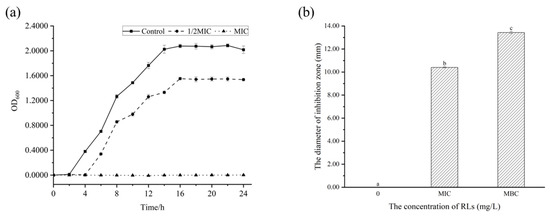 Effect of Rhamnolipids (RLs) on the growth of B. cereus. (a) Growth curve, (b) antibacterial zone. Significant difference (p < 0.05) was indicated by different letters.