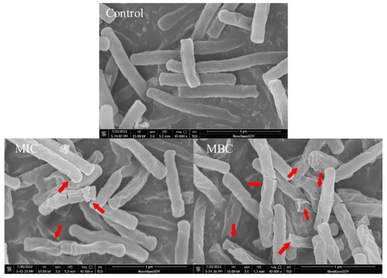 Scanning electron microscopy (SEM) images (×40,000) of B. cereus with different treatment. The red arrow marks the region of the B. cereu cell that has been damaged.