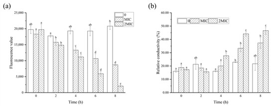 Meanwhile, the membrane potential and relative conductivity were measured to assess the cell membrane permeability, as shown in Figure 6. The membrane potential of B. cereus decreased significantly (p < 0.05) after RL treatment (Figure 6a), as indicated by the reduced fluorescence intensity of Rhodamine 123, a cationic fluorescence probe with cell membrane permeability [26]. This decrease in fluorescence intensity occurred due to the disruption of the cell membrane integrity and permeability, which led to the outflow of intracellular potassium ions and hyperpolarization of the cell membrane. This observation was supported by Han et al. [27], who discovered that the addition of juglone resulted in a depolarization of cell membranes, leading to abnormal metabolic activity. The relative conductivity of the control group showed no significant change over time (p > 0.05). However, the experimental group treated with RLs exhibited an increasing trend in the relative conductivity of the bacterial solution, with the MBC group showing a more pronounced increase (p < 0.05). After 8 h of treatment, the relative conductivity of the MBC group rose to 46.58%, which was twice that of the control group. This indicated that the permeability of B. cereus cell membrane was altered by RLs treatment, resulting in the leakage of electrolytes from the bacteria.