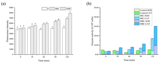 As demonstrated in Figure 8, the fluorescence values of the RL-treated group were significantly higher than those of the control, indicating that RLs caused a substantial amount of intracellular ROS production. ROS is known to be cytotoxic and can accumulate in large quantities, resulting in damage to bacterial biomolecules. The activities of CAT and SOD in B. cereus after being exposed to various concentrations of RLs for different durations were observed. This is likely due to the bacteria activating their oxidative stress response in response to RLs, which helps with chemical modification reactions taking place in proteins, lipids, and nucleic acids, altering their structure and function, thus having a detrimental effect on cell activity [29].