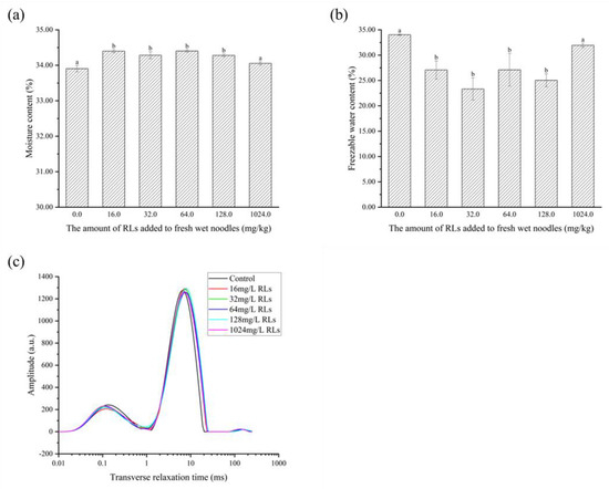 As shown in Figure 10a, the addition of RLs to FWN was found to increase the total water content due to its hydrating and hydrophilic properties [32]. Further analysis revealed that the freezable water content was significantly decreased (p < 0.05) in samples with RLs added (Figure 10b), likely due to RLs forming a closer bond with water, reducing the deep bound water activity and making it more difficult to freeze. This was further confirmed by the low-field nuclear magnetic resonance results (Figure 10c), which demonstrated that type I hydrogen proton peaks in fresh and wet surface samples with RLs shifted to the left, suggesting a stronger binding with water molecules. Thus, the addition of RLs from 16.0 to 1024.0 mg/L could reduce the free water content in FWN, thereby limiting the amount of water available to microorganisms and improving the storage stability of FWN.
