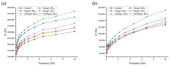 Changes in storage modulus G’ (a) and loss modulus G’’ (b) of fresh wet noodles (FWN) treated with Rhamnolipids (RLs).