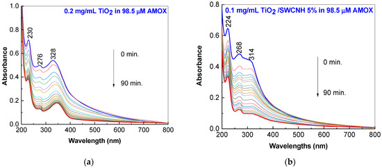 UV-VIS spectra of 98.5 μM AMOX solution containing 0.2 mg/mL TiO2/SWCNH composites with a SWCNH concentration of 1 wt.% (a) and 10 wt.% (b) during UV irradiation for 90 min.