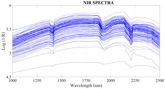 After drying in an oven at 50 °C for 48 h, the samples were measured in the FT-NIR spectrometer, PerkinElmer, with a reflectance accessory. The NIR spectra were obtained between 1000 and 2500 nm with 2 nm resolution and 32 independent scans for sample at wavelength steps of 0.5 nm. The dataset included 101 observations (samples) with 3001 wavelengths (variables).