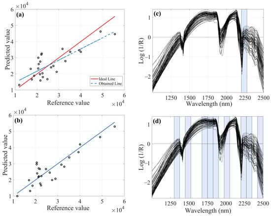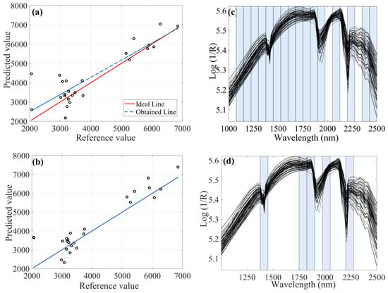Chemometric models with MSC as preprocessing for determination of titanium content: (a) Prediction set by iSPA-PLS; (b) Prediction sample set by FFiPLS; (c) Selected spectral regions by iSPA-PLS; (d) Selected spectral regions by FFiPLS.