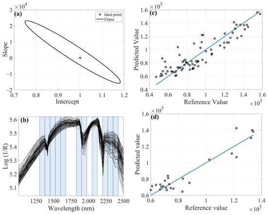 FFiPLS chemometric model with MSC as preprocessing for determination of aluminum content: (a) EJCR; (b) Selected spectral regions; (c) Predicted versus reference values for calibration sample set; (d) Predicted versus reference values for prediction sample set.