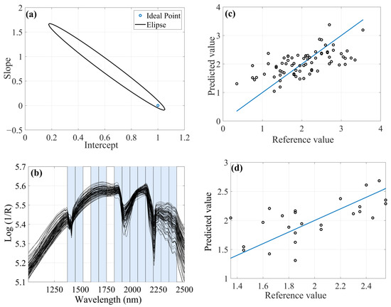 Chemometric models with SNV as preprocessing for determination of iron content: (a) Prediction sample set by iPLS; (b) Prediction sample set by FFiPLS; (c) Selected spectral regions by iPLS; (d) Selected spectral regions by FFiPLS.
