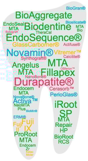 Commercial products based on bioceramics in clinical use that are most studied in the literature. Based on a search of the Scopus database, the products are represented with a font size according to their frequency in the title of an article and with a color code corresponding to the different types of bioceramics classified in the work: blue for bioactive glass (BG); yellow for glass ionomeric; pink for calcium phosphate (CaP); green for calcium silicate (CaSi).