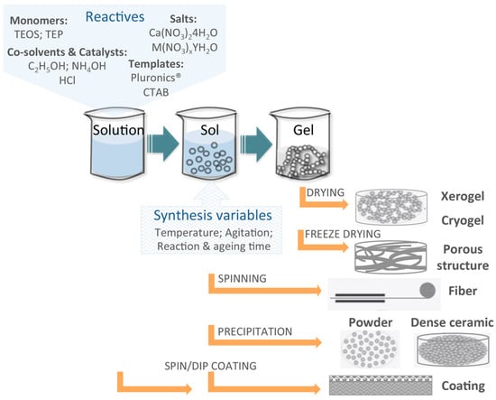On the other hand, control of the processing method makes it possible to vary the morphology of the synthesized materials and, thus, obtain particles, films, monoliths or fibers [33,34]. Additionally, the whole process can be easily scaled up for large-scale production. All these characteristics make it possible to obtain bioceramics with high added value, and there is much interest in finding new synthesis routes and processes that align these advantages with other equally important commercial aspects, with respect to the economic viability of scaling up sol–gel production [31].