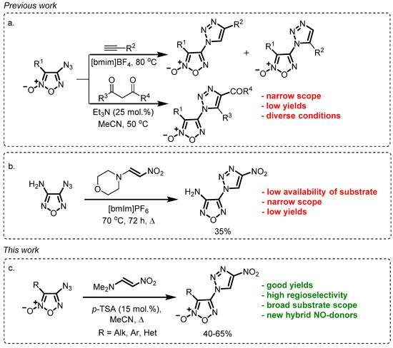 - Fershtat, L.L.; Ashirbaev, S.S.; Kulikov, A.S.; Kachala, V.V.; Makhova, N.N. Ionic liquid-mediated synthesis of (1H-1,2,3-triazol-1-yl)furoxans by [3 + 2] cycloaddition of azidofuroxans to acetylenes. Mendeleev Commun. 2015, 25, 257–259. [Google Scholar] [CrossRef]