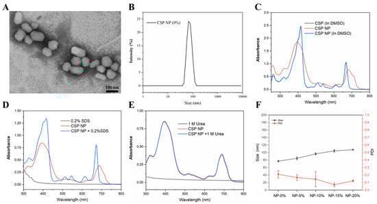 The self-assembly of individual CSP to prepare CSP NPs. (A) The TEM image of CSP NPs, scale bar: 100 nm. (B) The hydrodynamic size of CSP NPs. (C) UV–Vis spectra of CSP and CSP NPs in DMSO or water. (D) UV–Vis spectrum of CSP NPs in the absence or presence of 0.2% SDS. (E) UV–Vis spectrum of CSP NPs in the absence or presence of urea. (F) The particle size and PDI of various formulations of CSP NPs obtained at DSPE-PEG2000 content of 0%, 5%, 10%, 15% and 20%, respectively. Data are shown as mean ± SD (n = 3).