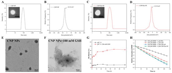 The excellent self-assembly performances of CSP prodrugs are fundamental to realizing further biological applications since the formed nanoparticles can increase the cellular internalization and further co-assemble with other drugs to form multifunctional nanomedicines. The self-assembly behaviors of CSP were primarily investigated. The nanoparticles (CSP NPs) can easily be formed from CSP via the reprecipitation method [43]. As shown in Figure 1A,B, the morphology of the harvested CSP NPs was found to be irregularly spherical, observed by transmission electron microscopy (TEM), demonstrating good self-assembly properties. The prepared CSP NPs had a hydrodynamic particle size of about 80 nm, measured by dynamic light scattering (DLS).
