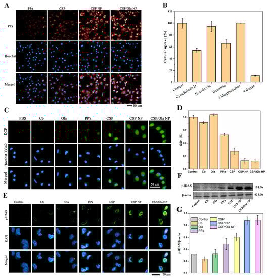 It has been reported that the Ola, as a PARP inhibitor, could suppress DNA damage repair to improve the sensitivity of chemotherapeutic drugs. Generally, the phosphorylated histone γ-H2AX is a biomarker of DNA double bond breakage and its high expression might reveal the enhanced DNA damage and the suppression of DNA damage repair [47]. The expression of γ-H2AX was first assessed by an immunofluorescence assay to verify the effects of CSP/Ola NPs on DNA damage and its repair in MDA-MB-231 cells. As shown in Figure 3E, the negligible green immunofluorescence could be observed in free the Cb, Ola, PPa or CSP group, indicating that these formulations had a poor ability to damage DNA. It is worth noting that CSP NPs induced the appreciable expression of γ-H2AX, implying that the DNA-damaging agent Cb encapsulated in CSP NPs functioned. In contrast, the highest expression of γ-H2AX was detected for the CSP/Ola NPs, suggesting that CSP/Ola NPs presented a synergistic effect on DNA damage and its repair inhibition due to the inherent function of co-loaded Cb and Ola, respectively. The above experimental results were also verified by Western blotting (Figure 3F,G). Collectively, these results confirmed that CSP/Ola NPs exhibited enhanced DNA damage and disrupted DNA damage repair capacity.
