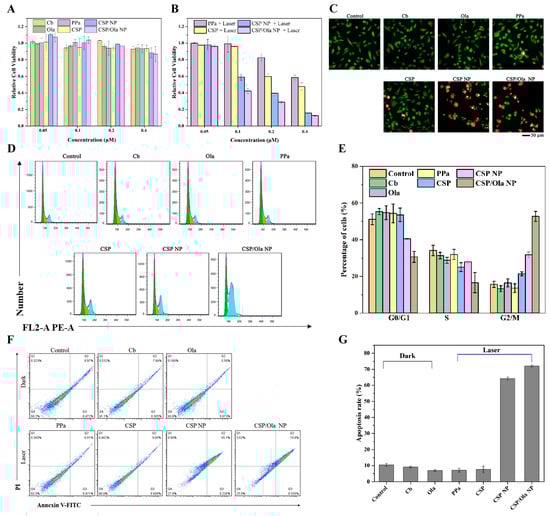 In addition, the impact of CSP/Ola NPs on the cell cycle progression of MDA-MB-231 cells was assessed by PI staining and detected by flow cytometry. As shown in Figure 4D,E, the cells in control, free Cb, free Ola, free PPa and CSP prodrug groups were mainly in the G0/G1 phase (~55%) and the S phase (~30%), while only ~15% cells were in the G2/M phase. After MDA-MB-231 cells were treated with CSP/Ola NPs under laser irradiation, the proportion of cells in the G2/M phase significantly increased to 55.29%, and the percentages of cells in the G0/G1 and S phase were significantly decreased to around 30.69% and 14.02%, respectively. These results suggested that CSP/Ola NPs could induce cell cycle arrest in the G2/M phase of mitosis, which led to cancer cell apoptosis.