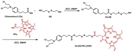 The Ola-loaded nanoparticles (CSP/Ola NPs) were prepared by encapsulating Ola with a GSH-responsive prodrug, which was coupled with Chlorambucil and PPa by a disulfide linkage (Scheme 1). Briefly, equivalent amounts of Chlorambucil and 2, 2′-dithiodiethanol conjugated to yield disulfide bonds-contained Cb-SS, which was further coupled with PPa though ester condensation in one step to obtain the novel photosensitizer-based prodrug (Cb-SS-PPa, named CSP). The structure of Cb-SS and Cb-SS-PPa were meticulously confirmed by 1H NMR, 13C NMR and HRMS (Figures S1–S6).
