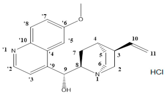 Quinine is a cinchona alkaloid that contains carboline. Its chemical name is (R)-(6-Methoxyquinolin-4-yl)[(1S,2S,4S,5R)-5-vinylquinuclidin-2-yl]methanol. This naturally occurring alkaloid is derived from the bark of the Cinchona tree, which grows in India, South America, and Indonesia. Quinine was the first effective drug for treating malaria. Moreover, quinine and its derivatives have been extensively studied for their potential as antibacterial, antiviral, and antiarrhythmic medications. Moreover, numerous cancer cell lines have confirmed their cytotoxic qualities. Many attempts have been made to produce analogs with improved biological efficacy. For instance, quinine dimerization using ester bonds or quinine modification using copper-catalyzed azide-alkyne cycloaddition (CuAAC) produced compounds that were more hazardous to cancer cells and Plasmodium falciparum. Recent research has shown that squaramides and quinine-based thioureas, which function as hydrogen-bond donors, are remarkably effective as Cl-ion transporters. Through the activation of a caspase-dependent mechanism, these chemicals preferentially induce apoptosis in cancer cells [1]. Since the discovery of quinine’s anti-malarial effects, it has been used in medicine to treat this parasitic disease for more than three centuries [2,3].