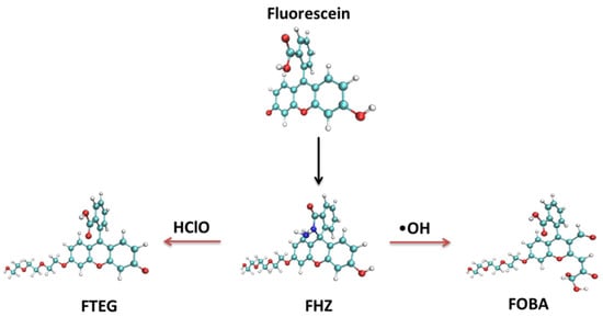 Large invasive effects and discrepant biological distributions of multiple probes hinder the effective simultaneous detections of several reactive oxygen species. A single fluorescent probe that can respond to several reactive oxygen species with distinguishable fluorescent signals would be very helpful for studying the correlation between reactive oxygen species and the life process. Such a single fluorescent probe, 6-triethyleneglycol substituted fluorescein hydrazide (FHZ), which could obtain the effective discrimination and profiling of hydroxyl radicals (•OH) and hypochlorous acid (HClO) in living organisms, was reported by Zhang et al. recently [47]. The two reaction sites of the probe FHZ corresponded to •OH and HClO simultaneously, resulting in cyan (486 nm) and green (520 nm) emissions, respectively. An additional five-membered heterocyclic ring and a lateral triethyleneglycol chain were chemically grafted to fluorescein to construct the probe FHZ which was non-fluorescent with dual reactive sites to •OH and HClO, respectively. The synthetic process of the probe FHZ and its reaction with •OH and HClO are illustrated simply in Figure 1. ChemDraw figures of the four molecular structures are given in the supporting information (Figure S1). The successful application of the probe FHZ in different living organisms shows the versatility of this fluorescent probe and its potential as a powerful tool in investigations of reactive oxygen species in living systems.