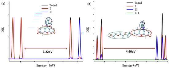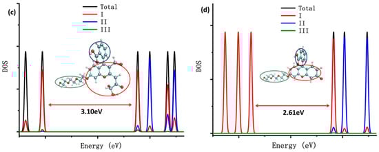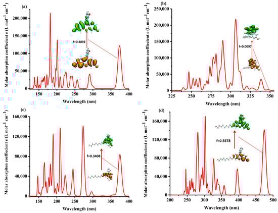 The time-dependent density functional theory (TDDFT) was used for studying the electronic excited states of the four probe molecules. The theoretical ultraviolet absorption spectrum and the corresponding electron excitation in the process from ground state S0 to the lowest singlet excited state S1 of the four probe molecules are shown in Figure 8.