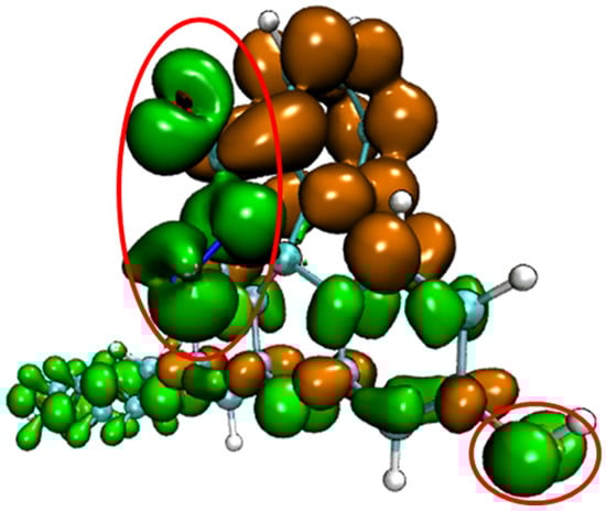 Conceptual density functional theory (CDFT), also known as density functional reactivity theory (DFRT), which was initially developed by Parr, is an important component in the field of quantum chemistry and wave function analysis [48,49]. It is especially useful in predicting and explaining the reaction activity and reaction site of chemical structures. Fukui function and dual descriptor are very popular methods for predicting reaction sites defined under the conceptual density functional theory framework [50]. The dual descriptor of probe FHZ was obtained through Multiwfn 3.8(dev) analysis based on the ORCA output results and is illustrated in Figure 3.