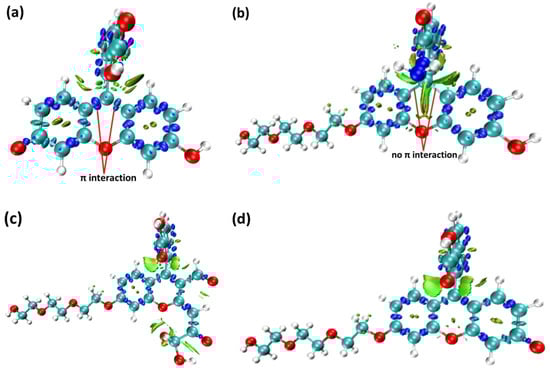 The interaction region indicator (IRI) function of (a) fluorescein, (b) FHZ, (c) FOBA, and (d) FTEG (isovalue = 0.05).