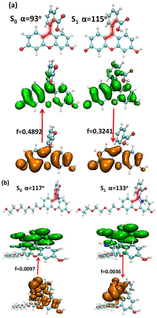 The stable ground state geometric structures of the four probes (fluorescein, FHZ, FETG, and FOBA) were searched under the combination of PBE0/def2-TZVPD with D3 dispersion and geometrical counterpoise (gCP) correction to remove artificial overbinding effects from Basis Set Superposition Error (BSSE) through the ORCA 5.0.1 program [53,54,55,56,57].