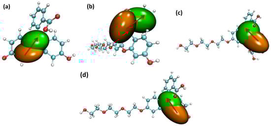 The center of the hole and electron’s distribution for the four probe molecules from S0 to the S1 state: (a) fluorescein, (b) FHZ, (c) FOBA, and (d) FTEG (isovalue = 0.002 orange: hole; green: electron, red arrows indicated the direction of electron transfer).