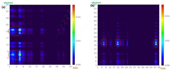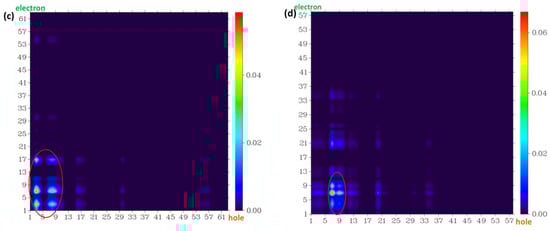 The atom–atom transfer heat map for the four probe molecules from S0 to the S1 state: (a) fluorescein, (b) FHZ, (c) FOBA, and (d) FTEG. The contribution to the hole (electron) from all of the atoms was normalized to unity (red circle indicated the atoms with big contribution).