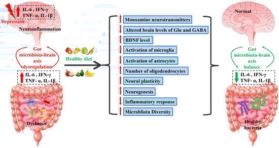 Summary of the relationship between gut microbial–brain axis and depression and the role of dietary regulation. The stress state leads to dysbiosis of the gut microbiota, increasing pro-inflammatory cytokines, mainly IL-6, IFN-γ, TNF-α, and IL-1β, and this situation can be reversed through dietary modulation. Dietary modulation may improve depressive symptoms by upregulating monoamine neurotransmitters, modulating the levels of glutamate and GABA in the brain, upregulating BDNF expression, modulating glial cells, synaptic plasticity, and neurogenesis, as well as reducing the inflammatory response and the diversity of microbiota. IL-6: interleukin-6; IFN-γ: interferon gamma; TNF-α: tumor necrosis factor; IL-1β: interleukin-1β. Upward arrows: increase. Downward arrows: decrease.