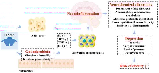 The Expert Consensus of Overweight/Obesity Medical Nutrition Therapy in China (2016 edition) advocates 5 days of normal eating and 2 days of light fasting, called 5 + 2 light fasting, which can intervene in bad dietary habits and improve mood [339]. The Orthodox Christian Church (COC) dietary regimen involves strict fasting periods characterized by the abstention from animal products and the increased consumption of fruits, vegetables, and legumes. The COC fasting diet is associated with lower levels of depression and anxiety and better cognitive performance in middle age [340]. However, studies have found that a long-term low-quality diet can increase the likelihood of depressive symptoms in elderly individuals [341]. For older persons, adopting a healthy “Mediterranean” diet rich in vegetables and whole grains may reduce the risk of developing depressive symptoms [342]. Population studies suggest that dietary patterns and specific dietary factors may reduce the risk of depression [173]. The results of a meta-analysis suggest that a healthy diet of fruits, vegetables, whole grains, and fish may reduce the risk of depression, while a Western diet characterized by processed meat, refined grains, sweets, and high-fat dairy products may increase the risk [343]. Furthermore, it is worth considering the potential links between diet-related factors, such as obesity and metabolic conditions such as type 2 diabetes, and their impact on mood and mental health [344,345]. Animal studies have provided valuable insights, demonstrating that a short-term high-fat diet can lead to the overactivity of orexin neurons, potentially contributing to persistent depressive states [346]. Additionally, this dietary factor induces anxiety and anhedonia in rats by altering the insulin/mTORC1 signaling pathway, affecting synaptic plasticity and the production of pro-inflammatory cytokines [347]. The significant comorbidity between obesity and depression, which can lead to a vicious cycle of emotional overeating exacerbating metabolic dysfunction, highlights the complex relationship between metabolic and mood disorders [348]. Additionally, there is a correlation between obesity and chronic low-grade inflammation, which may directly contribute to depression in individuals with obesity [349,350]. The complexity of this interaction is further underscored by the potential of obesity to trigger both an increase in fat cells, leading to the release of inflammatory factors, and instability in the gut microbiota, which also contributes to the release of inflammatory molecules [351,352]. Activation of inflammatory factors stimulates immune cells, resulting in neuroinflammation and subsequent neurochemical changes, including HPA axis dysfunction, neurotransmitter metabolism abnormalities, and neurotrophic factor disruptions [353,354]. These alterations may contribute to depression development and increase the risk of obesity [355]. These intricate relationships are visually illustrated in Figure 2. Additionally, our laboratory’s research has revealed intriguing insights into dietary conditioning, including a 9-h fasting regimen, which demonstrates an antidepressant-like effect and significantly improves depression-like behavior in OVX mice [356]. The possible mechanisms may be related to the activation of the 5-HT2 receptor and CREB-BDNF pathway [356,357]. Dietary interventions sometimes produce conflicting results in studies, and this complexity needs further study [358]. These results underscore the importance of making healthy dietary choices. There is no perfect food, only a proper diet.