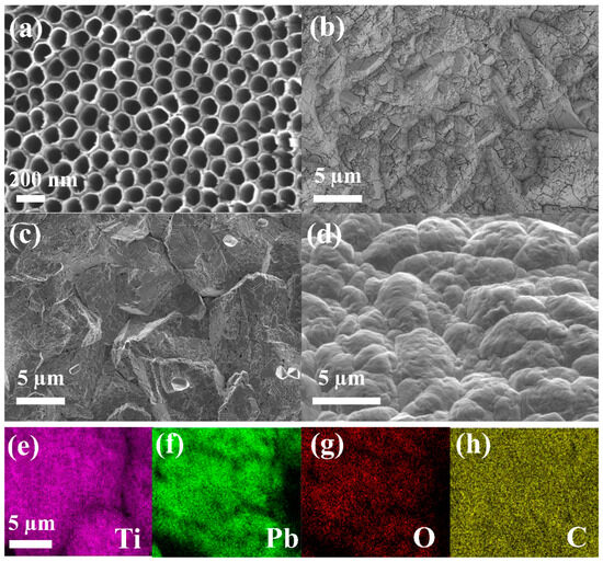 SEM images of the surface morphology of (a) Ti/B-TiO2-NTs, (b) Ti/TiO2-NTs/PbO2, (c) Ti/B-TiO2-NTs/PbO2, and (d) Ti/B-TiO2-NTs/PbO2-SDS electrode; EDS elemental mappings for Ti (e), Pb (f), O (g), and C (h) on the Ti/B-TiO2-NTs/PbO2-SDS electrode surface.