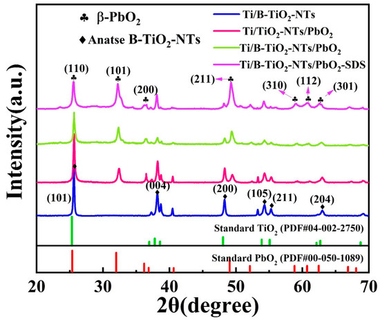For the XRD pattern of the PbO2 electrode in Figure 2, the diffraction peaks for all samples located at 2θ = 25.56°, 32.28°, 36.23°, 49.11°, 58.96°, 60.76°, and 62.53° can be attributed to the (110), (101), (200), (211), (310), (211), and (301) planes of β-PbO2, respectively, which matched with the standard diffraction peaks of the JCPDS card (No. 76-0564). By comparison with three PbO2 electrodes, it can be clearly seen that the diffraction intensities of the (101), (211), and (301) planes of Ti/B-TiO2-NTs/PbO2 and Ti/B-TiO2-NTs/PbO2-SDS electrodes increased, while the diffraction intensities of the (110), (200), and (211) planes decreased. This means that Ti3+ self-doping and the addition of SDS do not alter the crystal structure but would affect the crystal plane orientation of β-PbO2 [16]. It can be argued that Ti3+ self-doping or SDS addition will change the electric double-layer structure, altering the growth mechanism of the PbO2 phase and electrodeposition kinetic process on the anode surface, which could inhibit the growth of (110) and (200). The average grain sizes of three different PbO2 electrodes were calculated using the Debye–Scherrer formula, as shown in Table S1. The results indicate that the average particle sizes of the β-PbO2 electrode significantly decreased upon doping with Ti3+ and adding the anionic SDS surfactant. The small crystal particle size is favorable for forming a large specific area, which is conducive to improving the electrochemical activity of the electrode. Thus, the results from XRD are consistent with the above-mentioned result of SEM.
