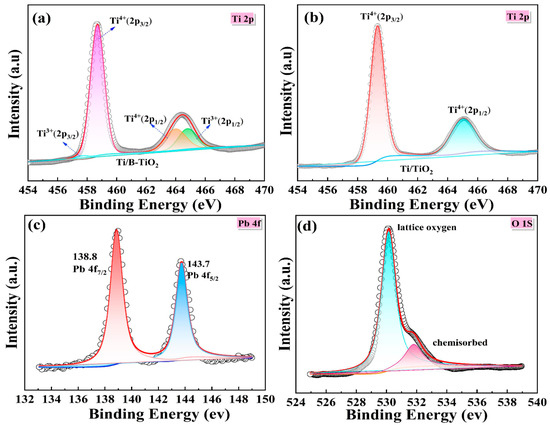 For the purpose of analyzing the chemical composition and surface elements on the prepared PbO2 electrode materials, the XPS measurements were used to investigate the chemical states and elementary composition of PbO2 electrodes. The results are shown in Figure 3a–d. The binding energy was corrected using the C 1s peak at 284.6 eV. From the survey spectrum shown in Figure S3, characteristic binding energy peaks of Pb, Ti, C, and O elements were found on the surface of the Ti/B-TiO2-NTs/PbO2-SDS electrode. The detailed spectrum of Ti 2p is shown in Figure 3a,b. The high-resolution XPS spectra of the Ti 2p peak of Ti/B-TiO2 can be deconvoluted into four peaks (Figure 3a). Two binding energies of 459.14 and 465.13 eV can be assigned to Ti4+, while the binding energies of 457.68 and 464.79 eV are attributed to Ti3+ [17]. Compared to Ti/TiO2-NTs (Figure 3b), the peaks of Ti/B-TiO2-NTs show a slight red-shift to higher binding energy (Figure S4). The results indicate that Ti3+ and oxygen vacancies exist in the Ti/B-TiO2-NTs, demonstrating that the Ti3+ reduction is irreversible. Therefore, the conductivity of Ti/B-TiO2-NTs can be markedly improved. In the detailed spectrum of Pb 4f in Figure 3c, the two peaks of Pb4f corresponding to Pb4+ 4f5/2 and Pb4+ 4f7/2 are shown at around 137.08 eV and 141.97 eV, which were identified as the spectral values of PbO2 [18]. The deconvolution of the O 1s spectrum could also be fitted into two characteristic peaks at 528.5 and 529.3 eV (Figure 3d), which belong to lattice oxygen (OL) and chemisorbed oxygen (Oads, OH) [19].