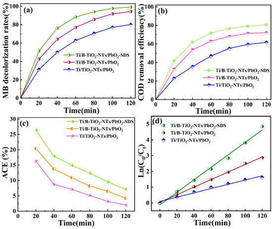 As the core component of the electrochemical oxidation process, anode materials play a key role that strongly depends on the efficiency of organic wastewater degradation. The electrocatalytic oxidation abilities of the three different PbO2 electrodes were investigated for the degradation of 30 mg L−1 MB with an applied current density of 40 mA cm−2 at 25 °C. In Figure 5a, it can be found that an MB decolorization rate of up to 99.7% was achieved by the Ti/B-TiO2-NTs/PbO2-SDS electrode during 120 min electrolysis, which was higher than that of the Ti/TiO2-NTs/PbO2 and Ti/B-TiO2-NTs/PbO2 electrodes. From Figure 5b, it is easy to observe that the Ti/B-TiO2-NTs/PbO2-SDS electrode exhibited the highest COD removal efficiency among the three prepared electrodes during 120 min, indicating its higher electrocatalytic oxidation capacity compared to the Ti/TiO2-NTs/PbO2 and Ti/B-TiO2-NTs/PbO2 electrodes.