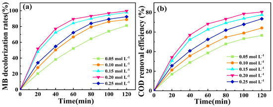 The supporting electrolyte concentration promotes the conductivity of the degradation solution and is an essential factor in the electrochemical degradation process for reducing energy consumption. The effect of Na2SO4 concentration from 0.05 to 0.25 M on the MB degradation efficiency was investigated at different supporting electrolyte concentrations. As displayed in Figure 7a,b, the MB decolorization and COD removal efficiency initially increase and then decrease. A similar tendency can be observed for the kinetic constant (k) (Figure S6d).
